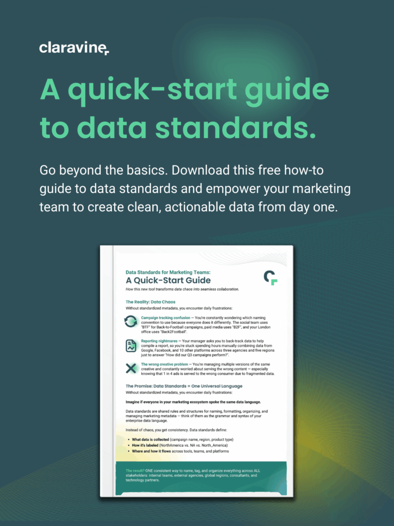 That’s why we created this quick-start guide, Data Standards 101. This essential guide is your first step toward transforming data chaos into seamless collaboration. We’ll help you move beyond the daily frustrations of messy metadata and provide you with a clear roadmap for success. You’ll discover how to create a universal language for your marketing ecosystem, ensuring that every campaign, team, and technology partner is on the same page.
